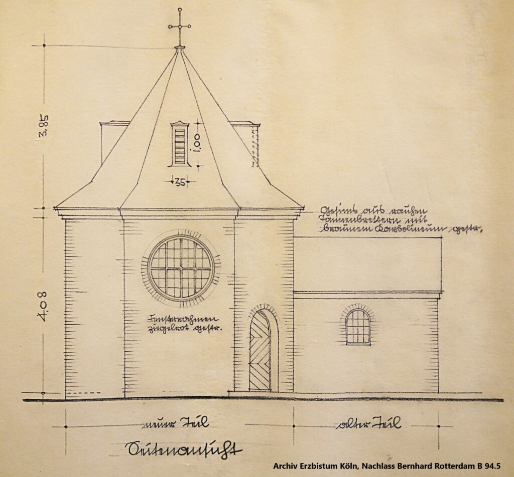Der erste, sehr aufwendige Entwurf nicht weiter verfolgt und stattdessen eine kleinere Kapelle mit je drei Rundbogenfenstern an den Seiten geplant: